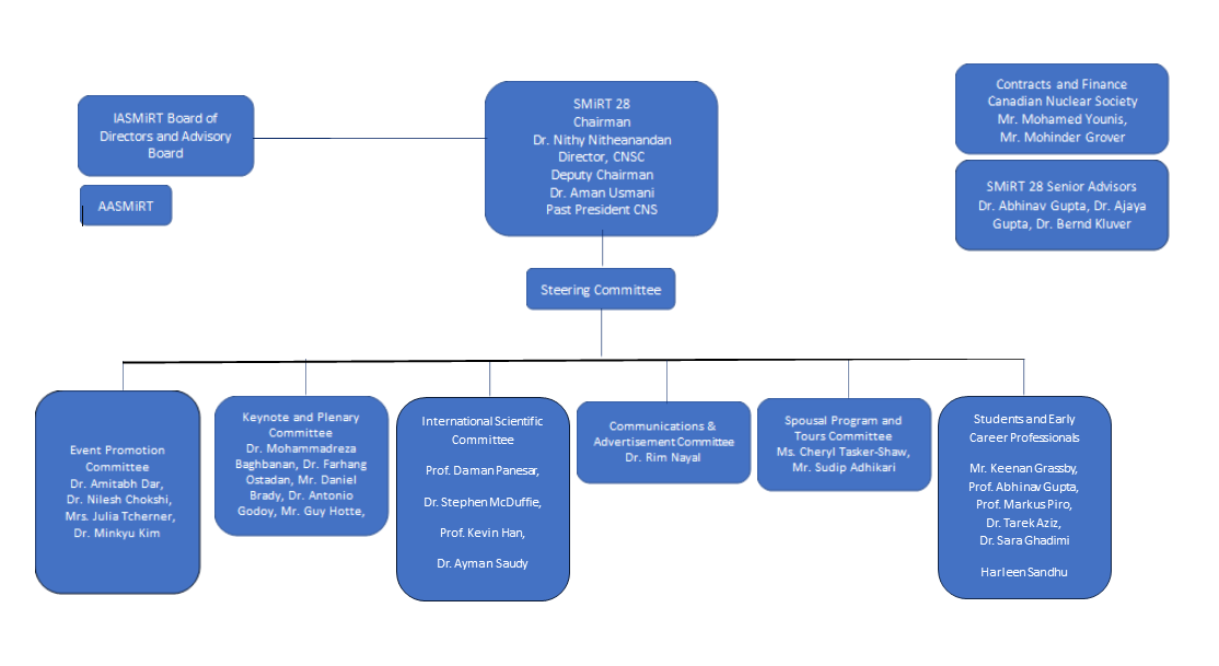 The 28th International Conference on Structural Mechanics in Reactor Technology was held from August 10-15, 2025 in Toronto, Canada. The venue was the Westin Harbour Castle. Chair’s Message The SMiRT28 conference will deliberate ways of “harnessing nuclear technologies and innovation as a path to net zero by 2050” in Toronto, “The Nuclear Energy Capital” of Canada, home to two large multi-unit stations in North America, Pickering and Darlington and another multi-unit station in Bruce within 200 km of Toronto. In 2015, the province of Ontario has invested CAD 26 Billion in a 15-year program, one of North America’s most significant clean energy projects. Canada and the US have recently become the focal point of SMR activities. Given all of the above developments, the 28th SMiRT conference in Toronto, Canada, will bring the international community together to learn from each other how to enhance safety and security in the emerging SMR technologies, among other initiatives Canada has embarked upon, such as isotope production in power reactors, decommissioning projects, and the use of innovative technologies in the nuclear industry. We welcome you to SMiRT28 in Toronto and share your research and experiences in harnessing nuclear technologies and innovation as a path to net zero by 2050. Dr. Thambiayah (Nithy) Nitheanandan Conference Chair SMIRT28 Organization Board & Advisory Board President Tsuyoshi Takada – University of Tokyo, Japan President-Elect and Chair of SMiRT 28 T. (Nithy) Nitheanandan – Canadian Nuclear Safety Commission, Canada Vice President and Secretary Irmela Zentner – Électricité de France, France Treasurer Emmanuel Viallet – Électricité de France, France Advisor General Abhinav Gupta – North Carolina State University, USA ADVISORY BOARD Chair Abhinav Gupta – North Carolina State University, USA Permanent Members Hiroshi Abe – Nuclear Regulation Authority, Japan Sung Pil Chang – Seoul National University, Korea Nilesh C. Chokshi – US Nuclear Regulatory Commission, USA Bijon Dutta – Bhabha Atomic Research Centre, India Rainer K. Gillot – MPA Universitat Stuttgart, Germany Ajaya Kumar Gupta – North Carolina State University, USA Asadour H. Hadijan – Defense Nuclear Facilities Safety Board, USA Bernd Kluever – TUEV NORD, Germany Farhang Ostadan – Bechtel Corporation, USA Goon-Cherl Park – Seoul National University, Korea Jorge D. Riera – Universidade Federal do Rio Grande do Sul, Brazil Rauno Rintamaa – VTT Technical Research Center of Finland, Finland David Shepherd – Cramjar Limited, UK Stan Vejvoda – Institute of Applied Mechanics, Czech Republic Folker H. Wittmann – Swiss Federal Institute of Technology, Switzerland Suyuan Yu – Institute of Nuclear and New Energy Technology (INET), China Two-year Members Naoto Kasahara – University of Tokyo, Japan Victor Kostarev – CKTI-Vibroseism, Russia Daman K. Panesar – University of Toronto, Canada Hamid Sadegh-Azar – University of Kaiserslautern, Germany Aman Usmani – Kinectrics, Canada Ayman Saudy – GE Vernova, Canada